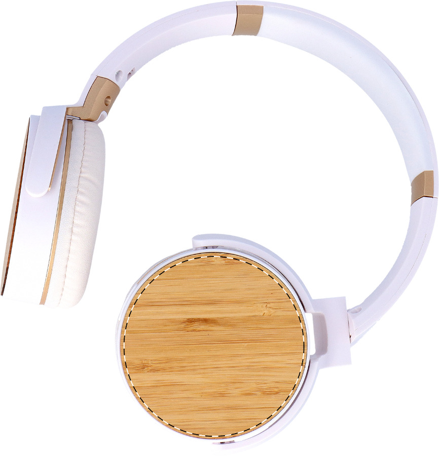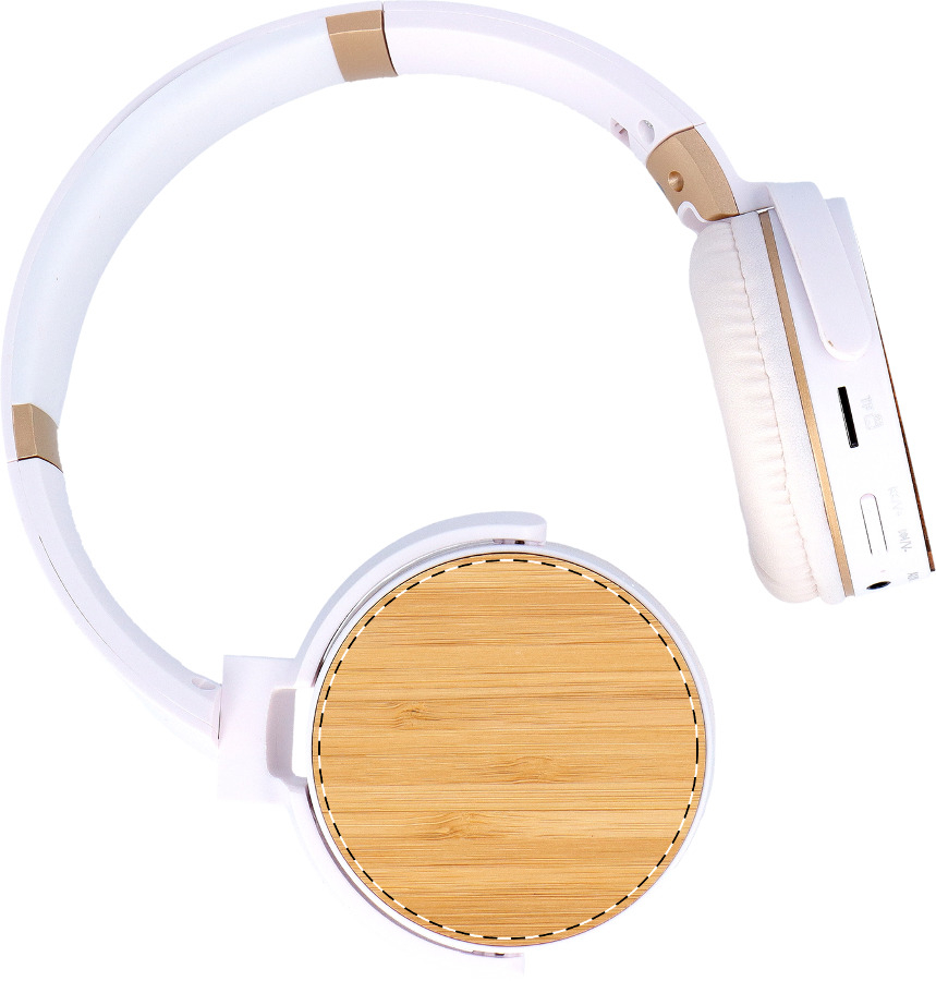 Kabellose Kopfhörer mit Bambusdekor und eingebautem Akku. Mit Freisprechfunktion und Micro-SD-MP3-Wiedergabefunktion. Inklusive 3,5 mm Audio Jack und USB-Ladekabel.