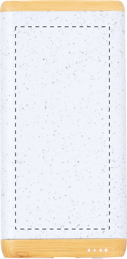 USB Powerbank aus Bambus und ökologischem Weizenstroh-Kunststoff mit 5000 mAh Akku, 1 USB und 1 USB-C Ladeports und USB-C Eingangsport. Inkl. USB-Ladekabel.